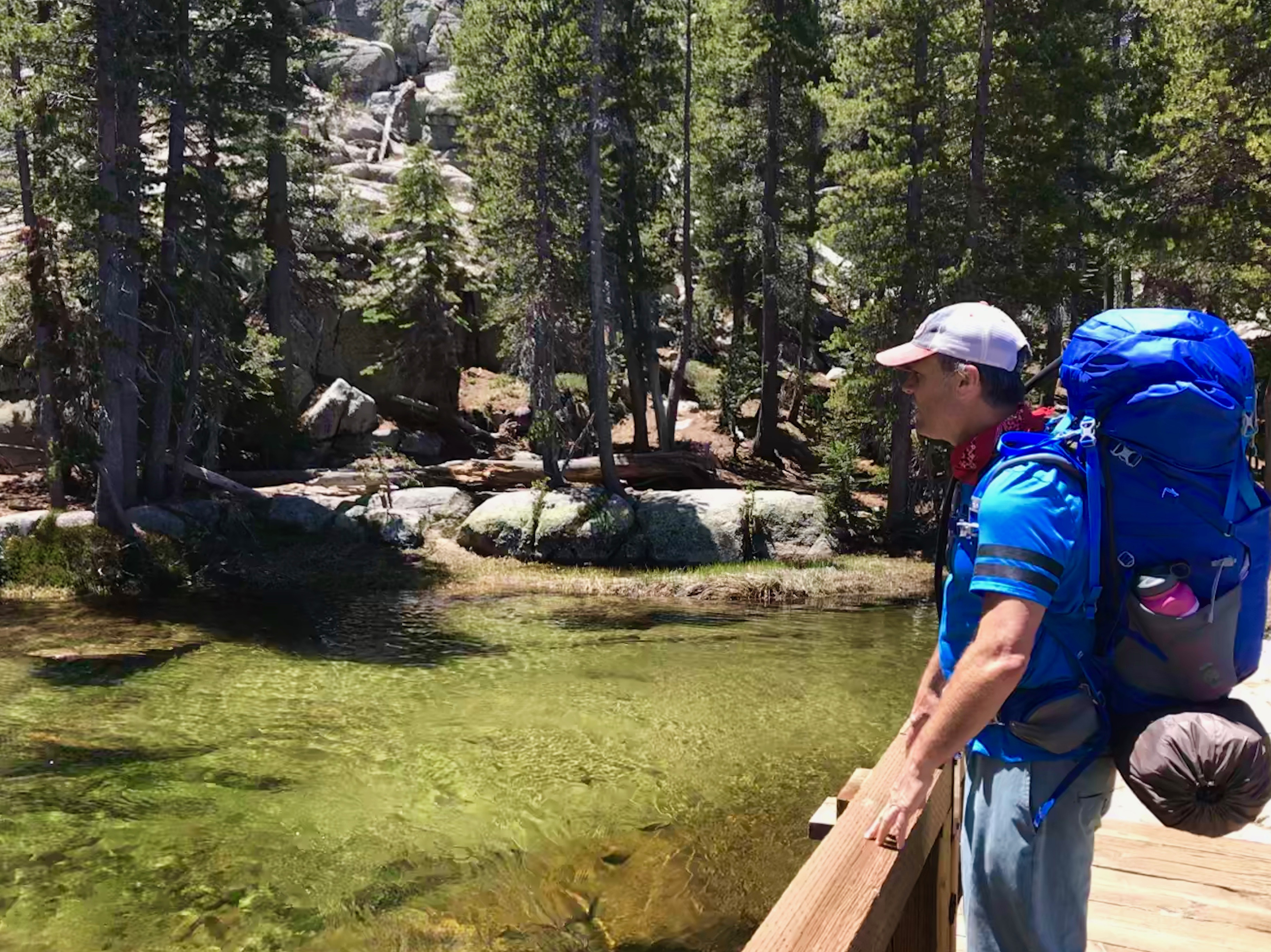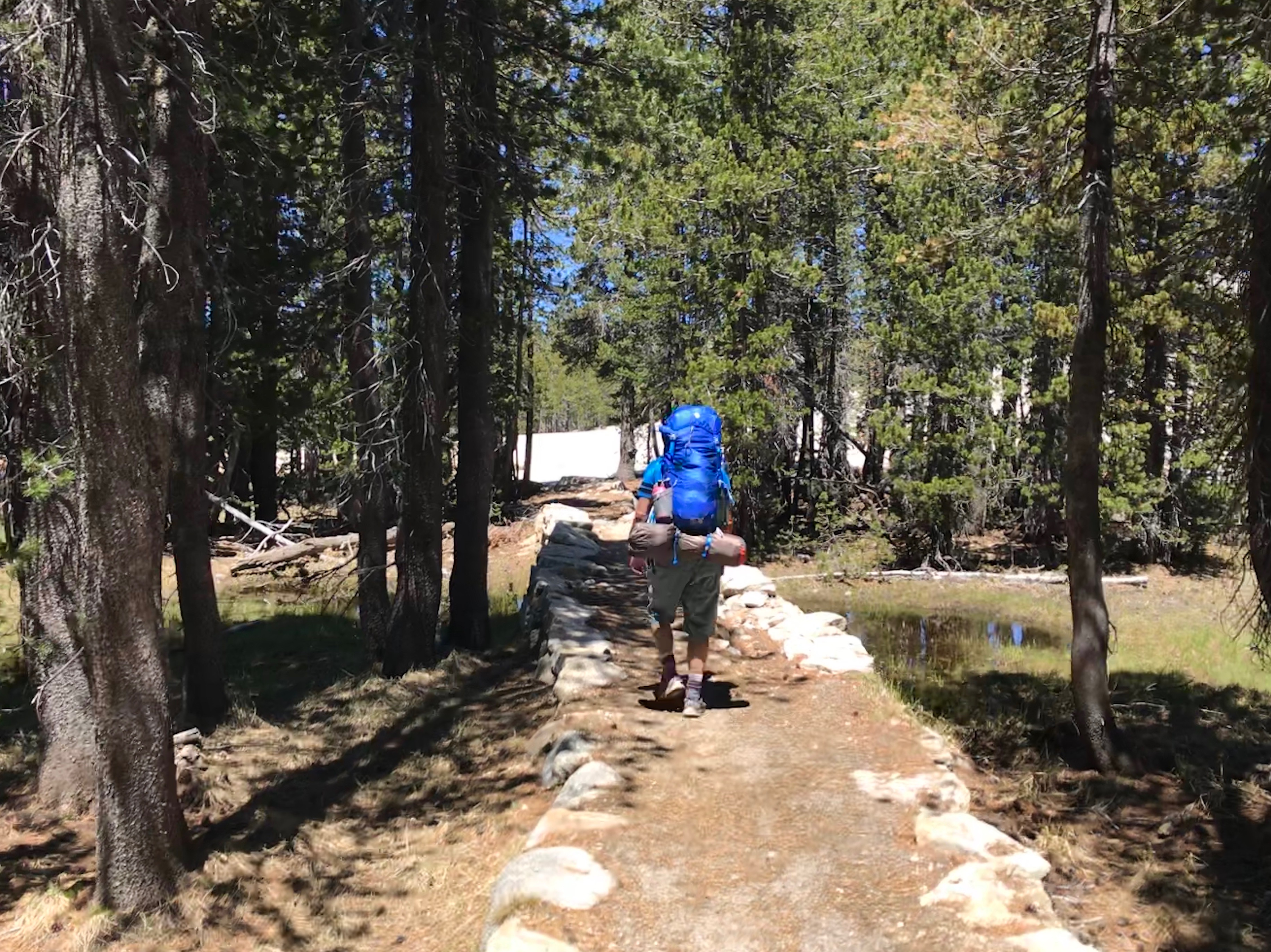 Day 1: We started our trek from the Glen Aulin trail head after picking up our wilderness permits from the Big Oak Flat Information Station. Having left home at 5am, we arrived at the station around 8:30am. There was a bit of a wait, as lines had already formed, but ultimately we were at the trail head about 9:40am. We were advised the best parking was on the left side of the road just before Lembert Dome. It was easy to find, and parking was no problem. There is a sign for “Soda Springs, Dog Lake, and Glen Aulin” just before the Wilderness Center directing you to parking.
