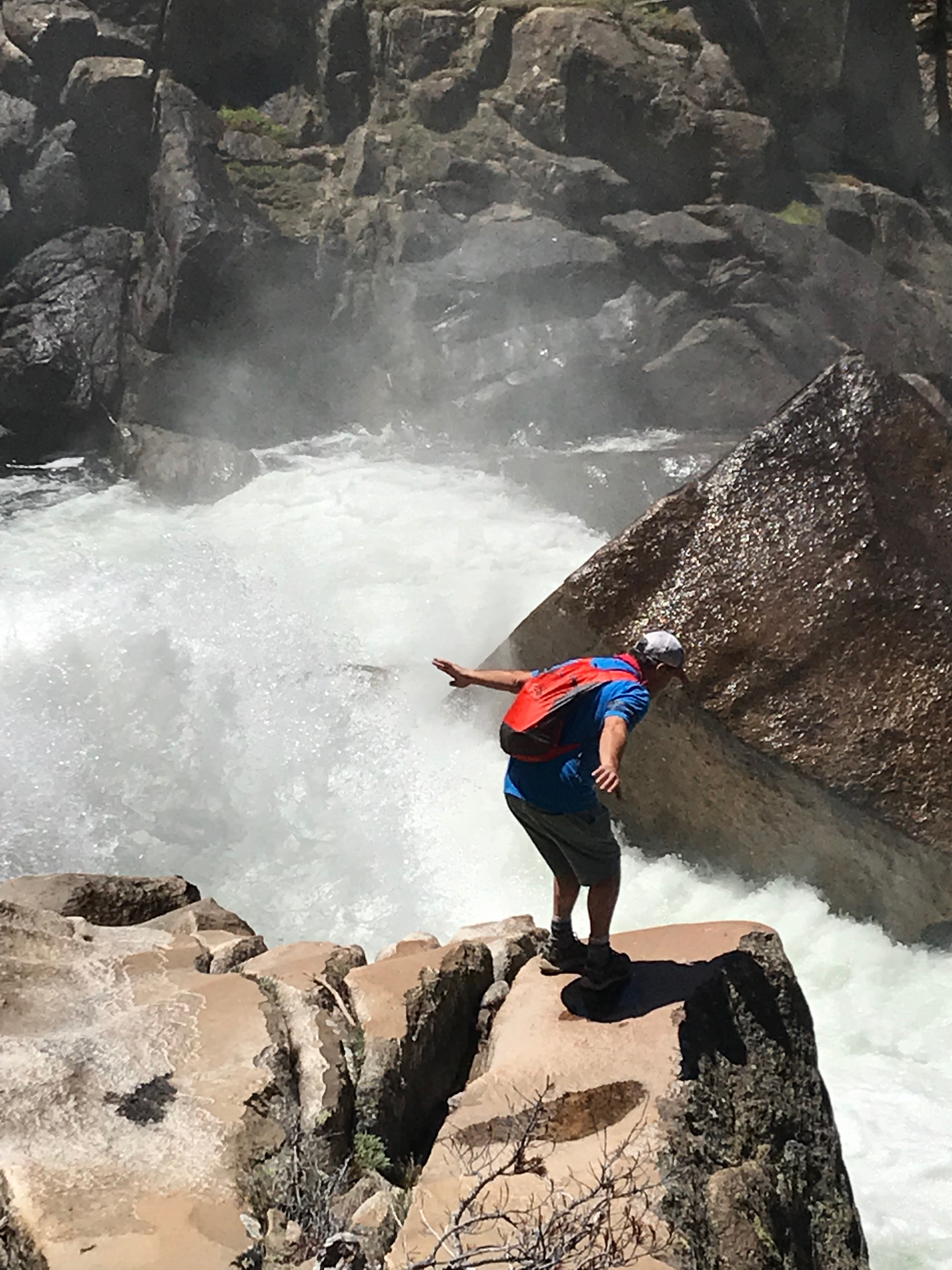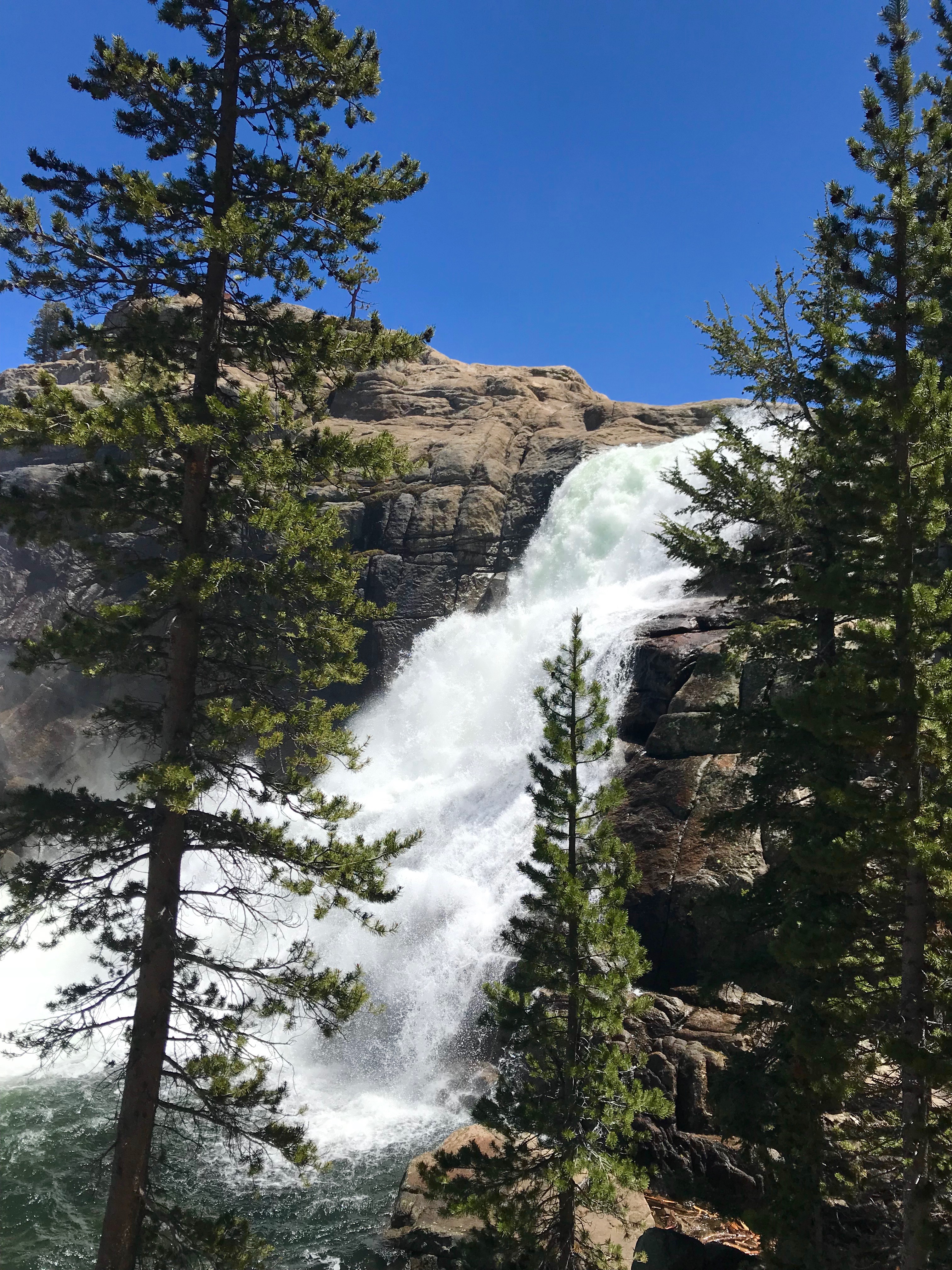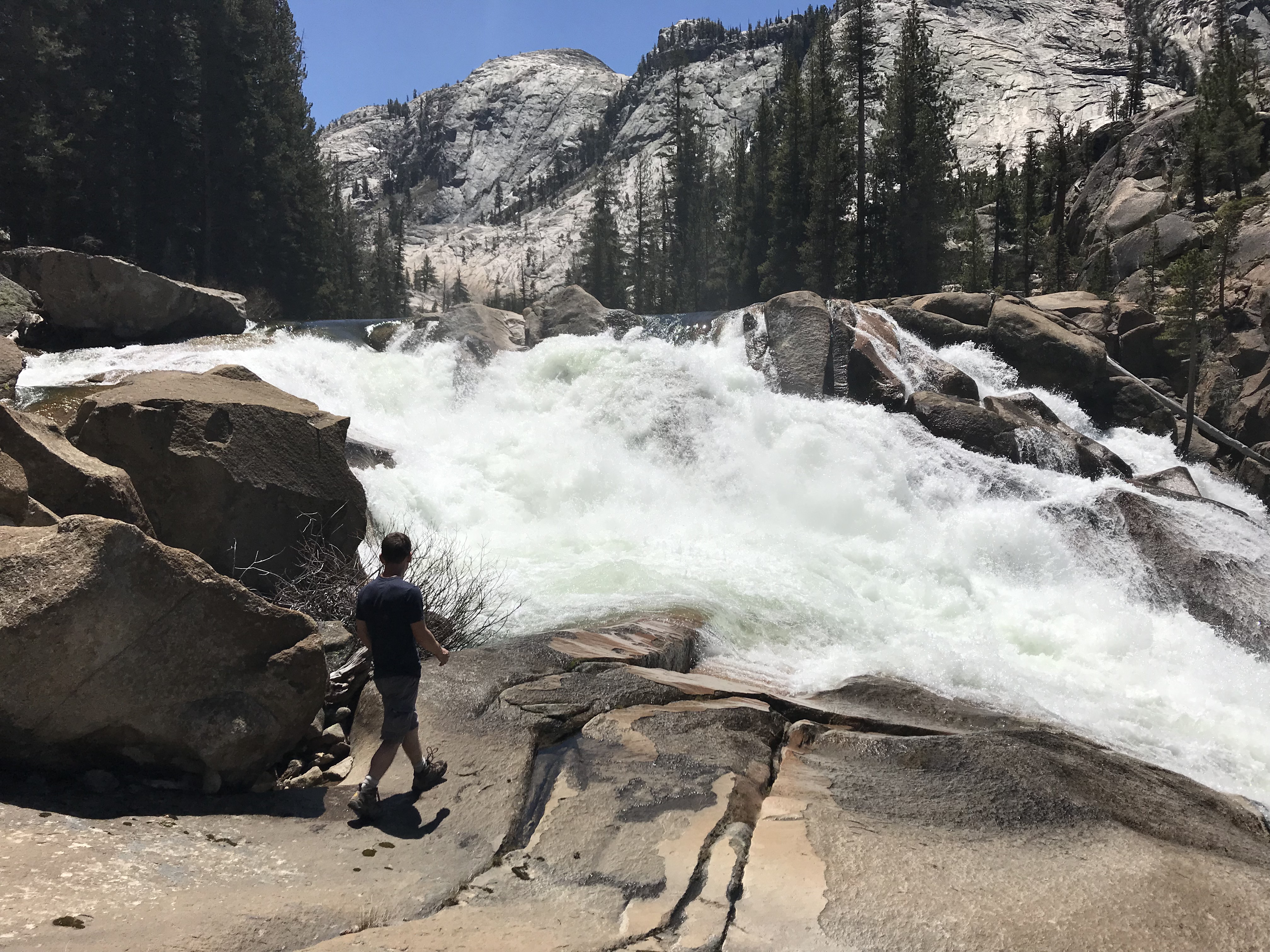 Along this trail, you will encounter three distinctly different, yet equally remarkable waterfalls in the following order: California Falls, Le conte Falls, and Waterwheel Falls. It is about 3 miles, to Waterwheel, but not wanting to have to retrace our steps uphill anymore than necessary, we stopped our trek at the point where we could get a side view of Waterwheel. Each Fall offers different terrain to explore and while it is possible to get on the rock fairly close to the water, I caution you (on good authority) to be careful on wet rock as it is extremely slippery and will land you on your backside before you’ll know what happened….. Yup… it happened to me. Taking breaks at each spot, we ultimately turned and made our way back up hill to camp. It is possible to continue downhill a bit more to get a better view of Waterwheel Falls and possibly a glimpse down the “Grand Canyon of the Tuolumne”.